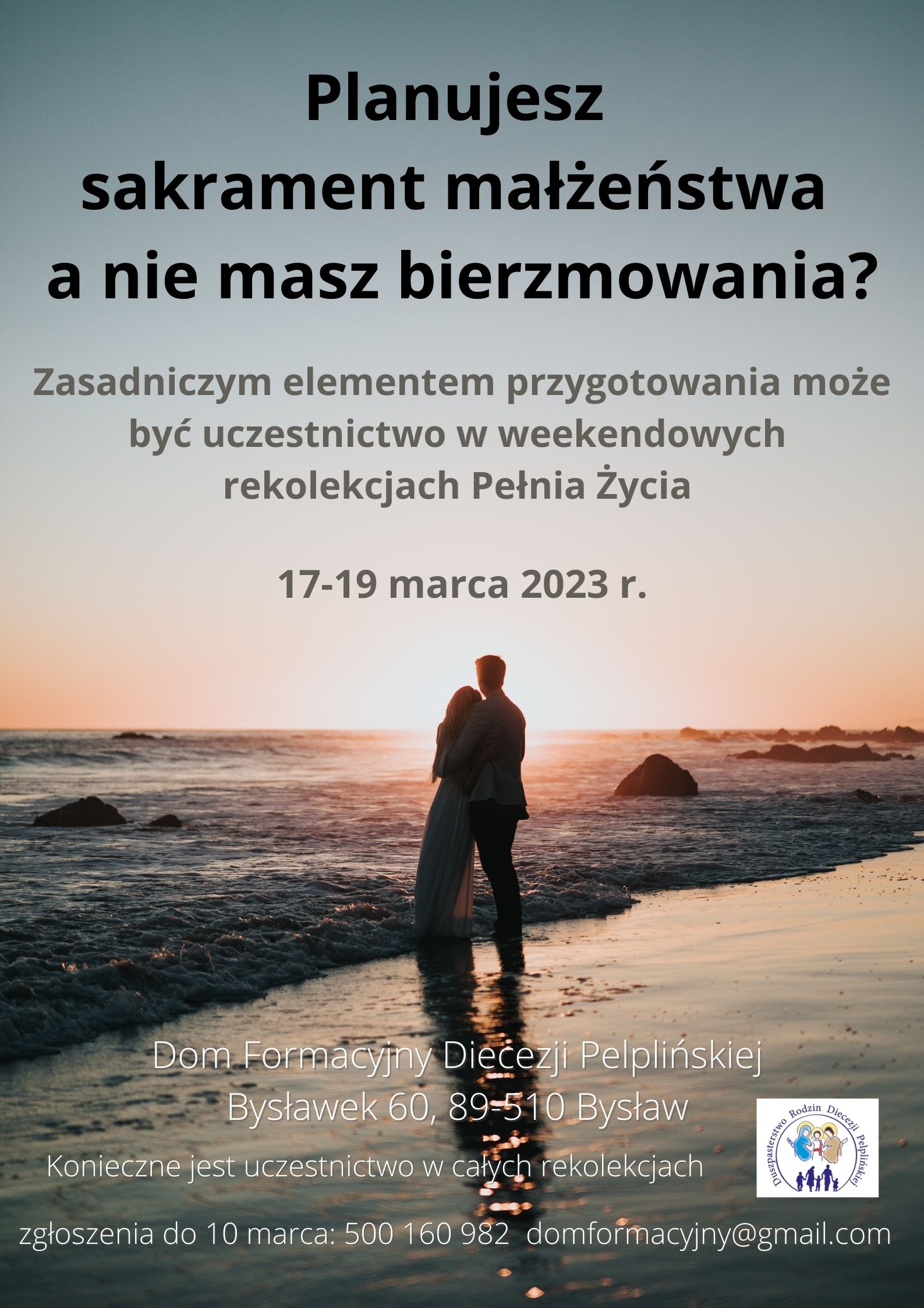 Osoby, które planują zawrzeć sakramentalny związek małżeński, a nie przyjęły sakramentu bierzmowania zapraszamy na weekendowe rekolekcje „Pełnia Życia” w dniach 17-19 marca br. w Bysławku k. Tucholi. Zapisy do 10 marca, więcej informacji można znaleźć na plakacie [KLIKNIJ TUTAJ].