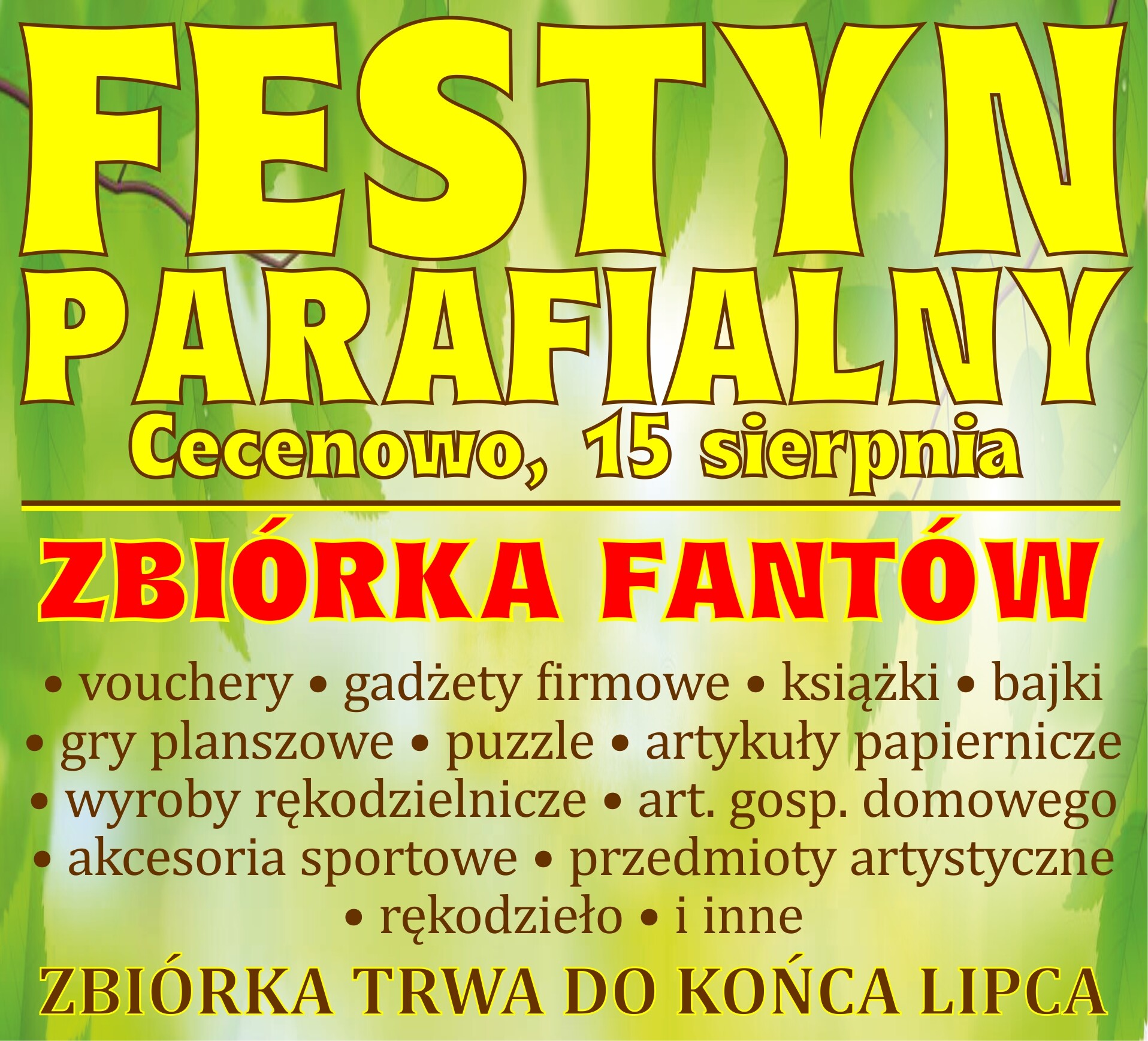 Przygotowujemy się do kolejnego festynu parafialnego. Serdecznie zachęcam, aby przynosić fanty na festynową loterię, licytacje oraz pchli targ. Zbiórka fantów trwa do końca lipca.